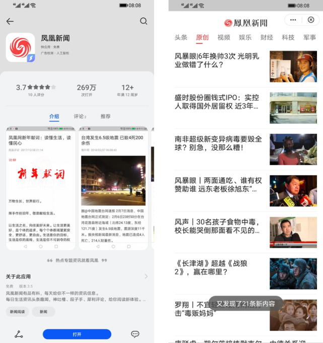 想要体验《凤凰新闻》快应用的小伙伴们赶快行动起来,进入华为应用市场首页-快应用,搜索“凤凰新闻”,就可以找到快应用版本,即点即得最新资讯哦!